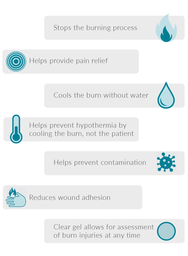 In a pre-hospital setting you would need 60 litres of cool clean running water for each burn injury and this isn’t always accessible or easy to do so in every environment. In any situation where a 20 minute supply of cool running water is not available there are alternative solutions such as burn gels.